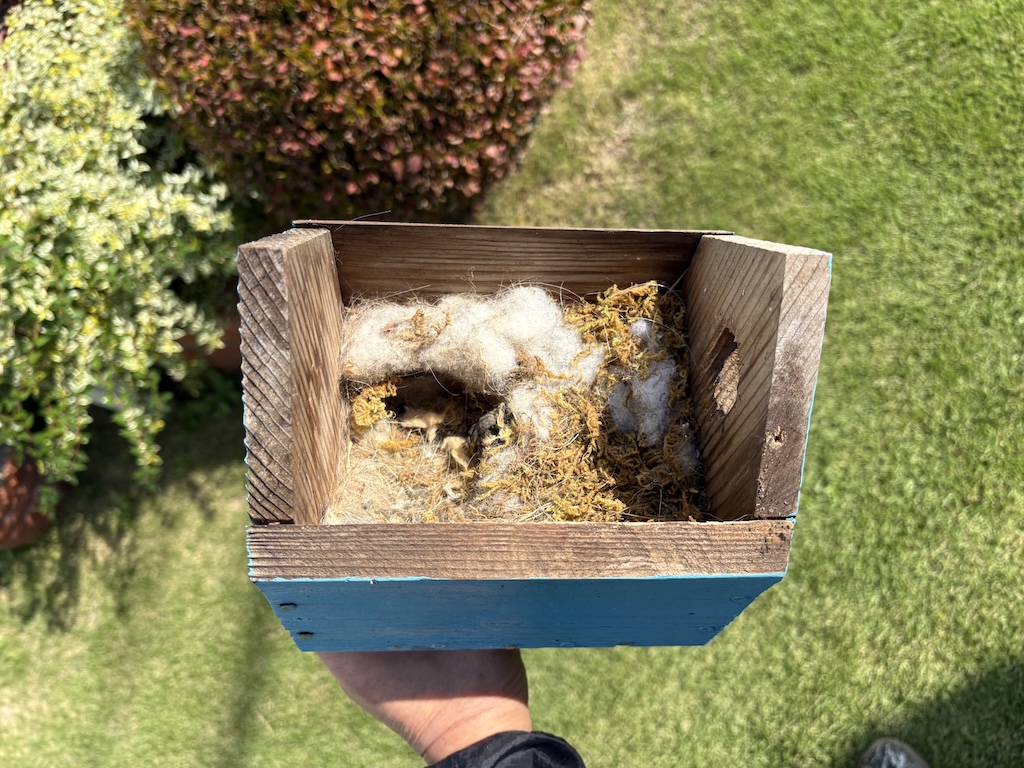 来年に備えて、庭の巣箱を木から降ろして掃除しました。残念ながら巣箱の中には 2 羽の小鳥が残っていました。1 羽は育っておらず、捕食できなかったのでしょう。もう 1 羽は一度、外に出たのですが、車庫の片隅で弱っていたものです。いったい何羽がこの巣箱にいたのか不明ですが、少し狭いのかも知れません。巣箱は古くなっているので、今回は少し大きく作り直そうと思います。