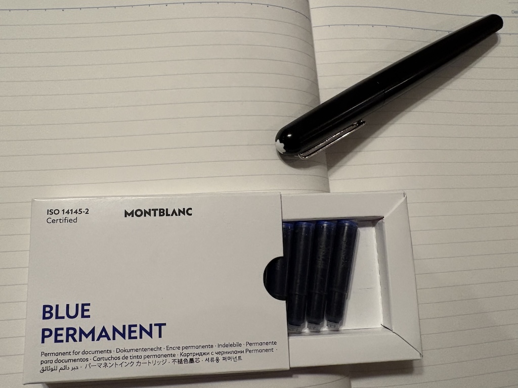 仕事で長年、万年筆を使っています。これまでパーカーを使ってきたのですが、間違って落としてしまい、ペン先を壊してしまいました。新宿のデパートで買った時のことを思い出します。とても使い易い製品でしたが、残念です。5 年ほど前に免税店で衝動買いしたモンブランの万年筆を出してきました。これは太字なので仕事には少し不向きなのと、インクが染料系なので油分が残っているノートだとインクの乗りが悪く、あまり使っていませんでした。調べてみると顔料系のインクが売られていることを知り、今日からこれを使い始めました。キャンバスノートでもきれいにインクが乗ってくれます。これでまた、万年筆で仕事ができます。